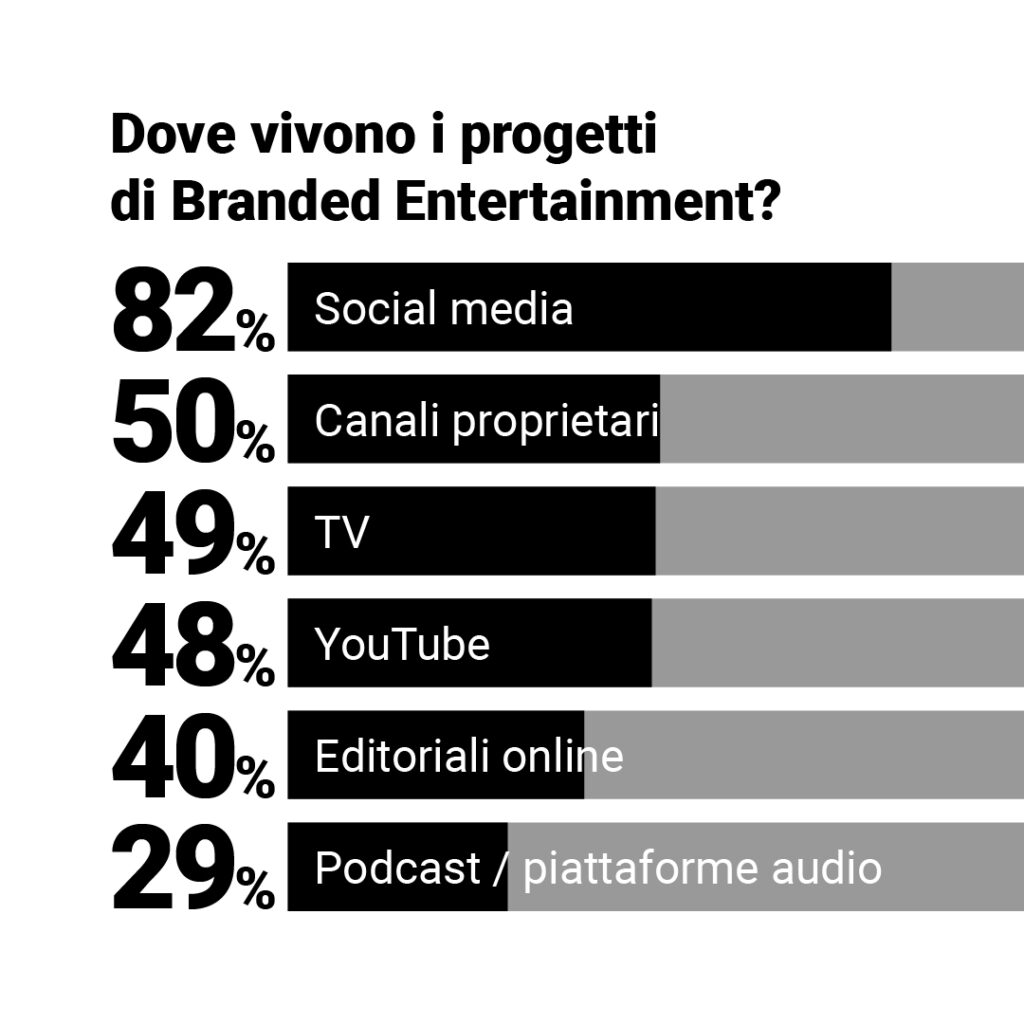 Il Branded Entertainment non convince: coinvolge. Non interrompe: attrae. I progetti di Branded Entertainment vivono là dove vive il pubblico: l’82% delle aziende li diffonde sui social media, mentre il 50% utilizza canali proprietari (siti, app, newsletter), confermando l’importanza dell’owned media. Seguono la TV (49%), YouTube (48%), e i contenuti editoriali online (40%), senza dimenticare le piattaforme audio e podcast, usate dal 29% delle aziende.