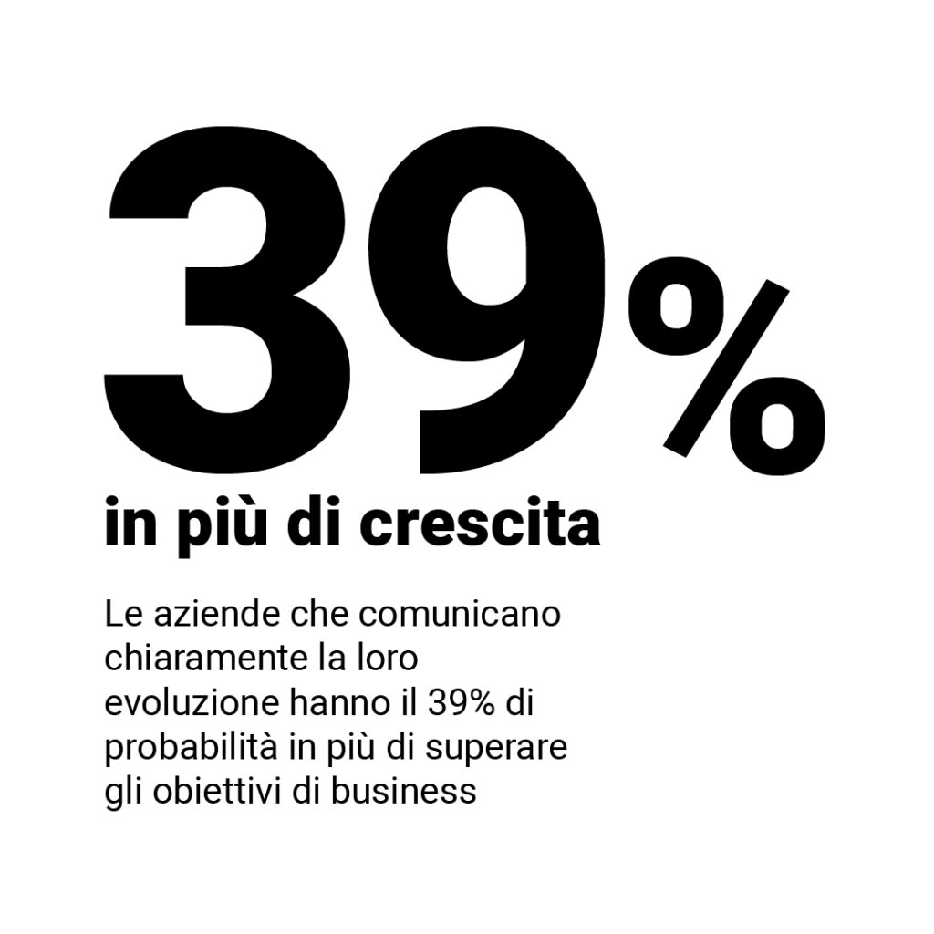 Gartner sottolinea che le aziende che comunicano chiaramente e in modo coinvolgente la propria evoluzione hanno il 39% di probabilità in più di superare i propri obiettivi di crescita.